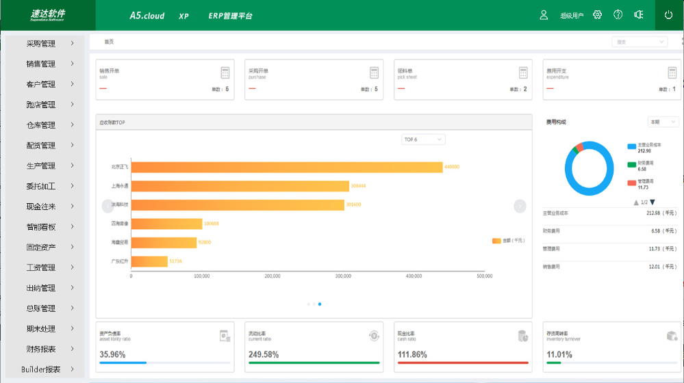 4. 速达 A5.Cloud XP ERP管理系统有多维度的智能经营看板可供查看,界面简洁实用,操作简单。