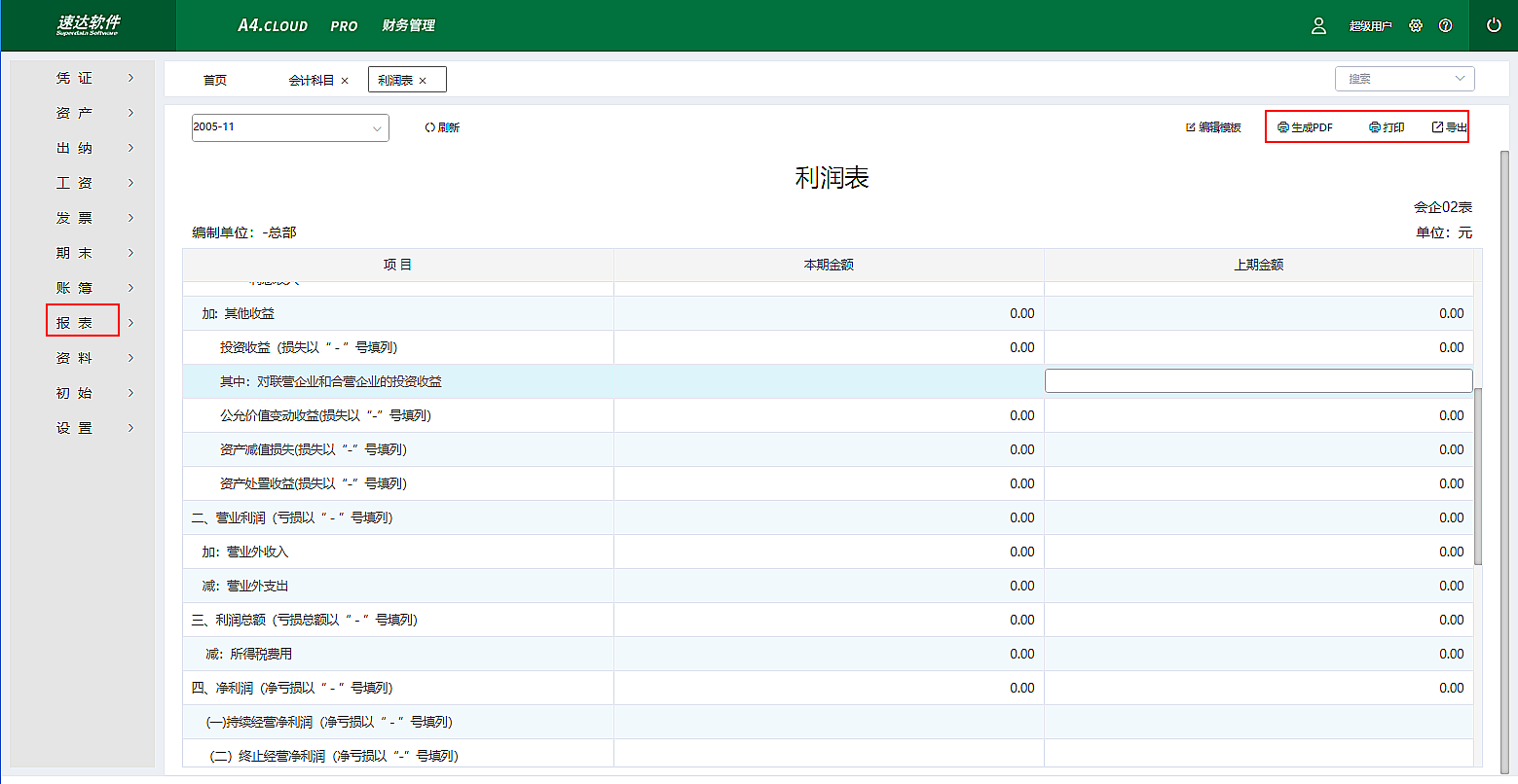 4.速达A4.Cloud PRO财务管理系统报表功能强大,种类模板基本满足宝力达机电需求。