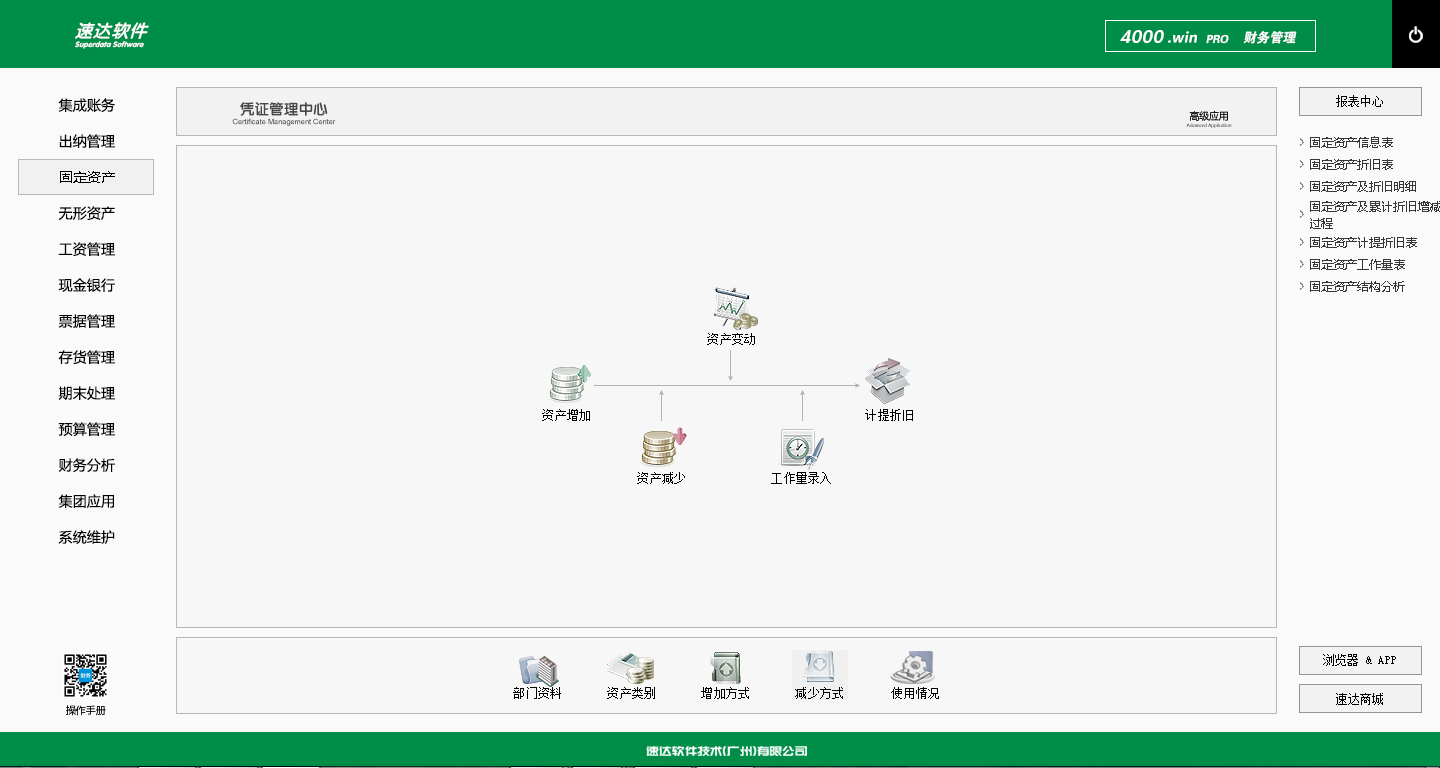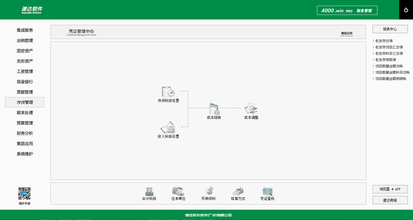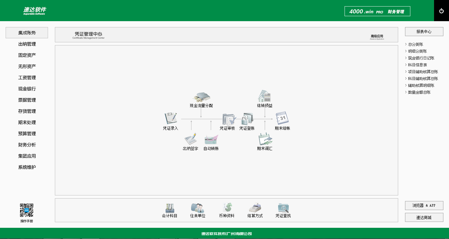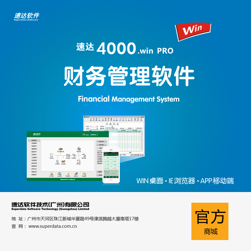 速达4000.win_PRO 财务管理系统完全符合国家现行会计制度标准。系统支持云部署和桌面服务器部署,高度满足企业应用需求,大大提升了应用效率和安全性。凭证管理中心向用户提供十分丰富的高级定义查询功能,全面提升企业管理能力。产品集财务管理、现金银行、出纳管理、 工资管理、固定资产、存货管理、坏账管理、预算管理、自定义报表于一体。特别适合中小企业使用。