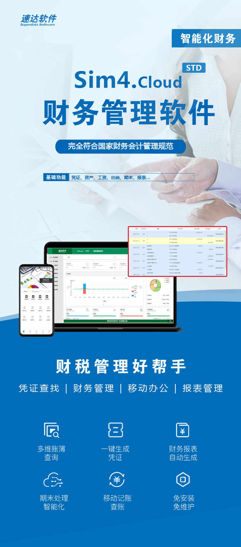 《速达Sim4.cloud》 财务管理软件是一套基于云应用的云软件,它可云部署或 PC 端部署并支持移动端应用,堪称小型企业管理软件典范。 《速达Sim4.cloud 》 强大实用的管理功能为企业业务发展带来很好的帮助,数据相互穿透、汇总报表齐全、统计快捷、数据分析/备份,全面提升企业管理效率。