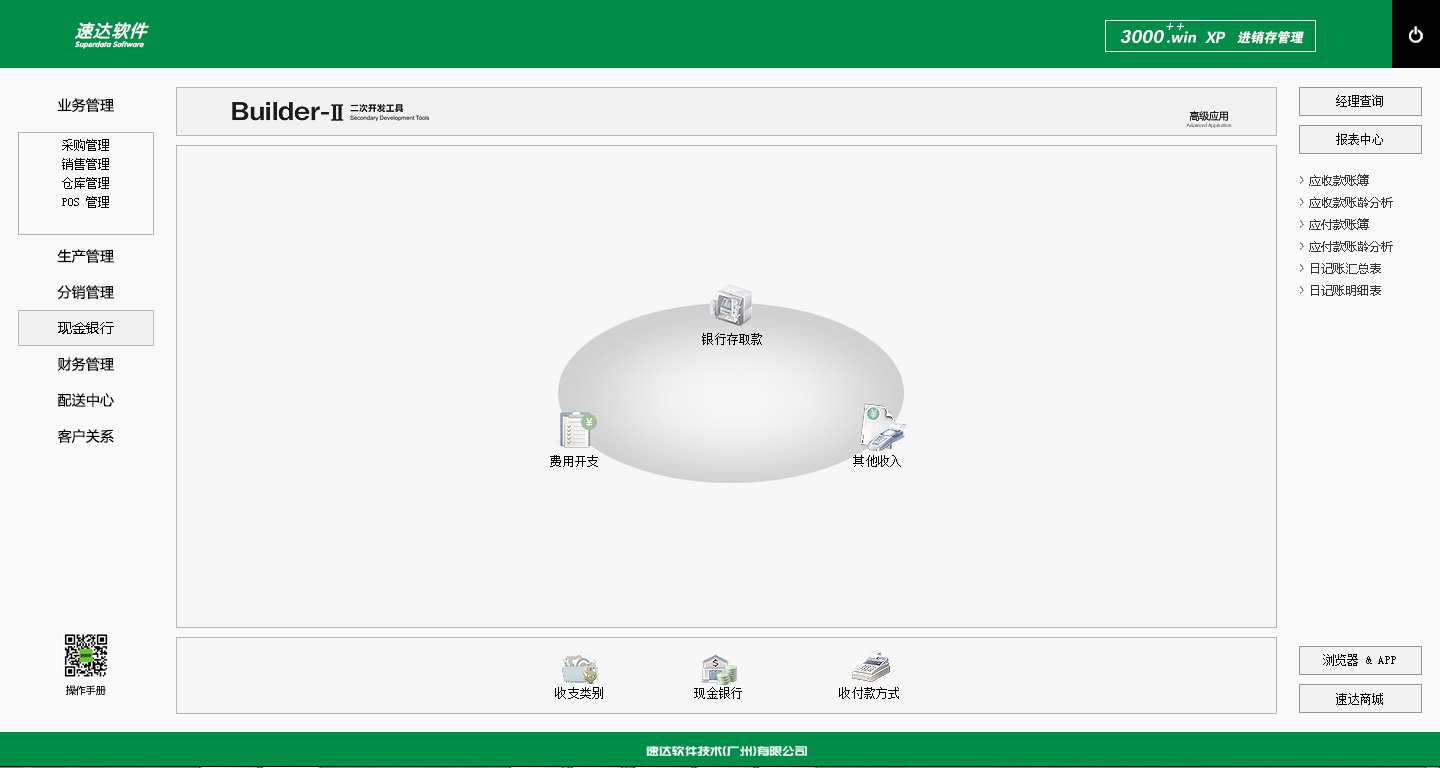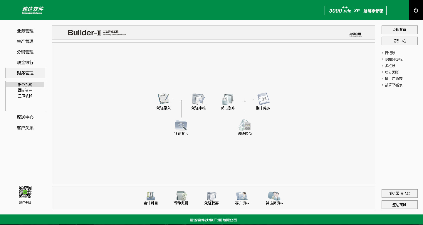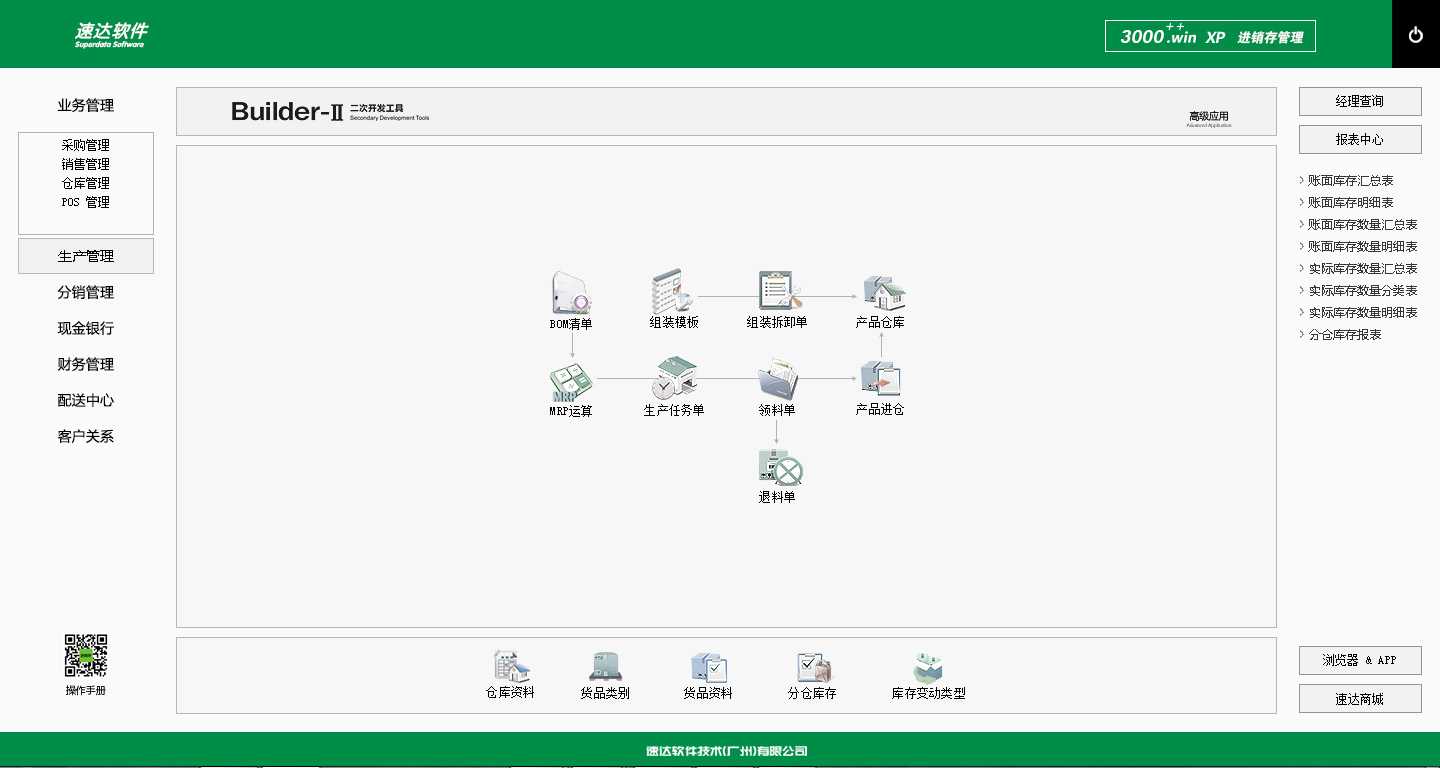 速达3000.win 集进销存、POS、财务、生产、CRM为一体的中小企业管理软件。软件支持云部署和桌面服务器部署及APP部署,并科学地融入Builder-II二次研发工具,满足企业管理的个性化需求,大大提升了应用效率和安全性。 软件支持局域网/互联网多用户应用,实现异地多机构、多店面、多仓库等远程应用,支持APP移动端应用,数据实时同步,安全、稳定、高效、易维护,特别适合中小企业使用。